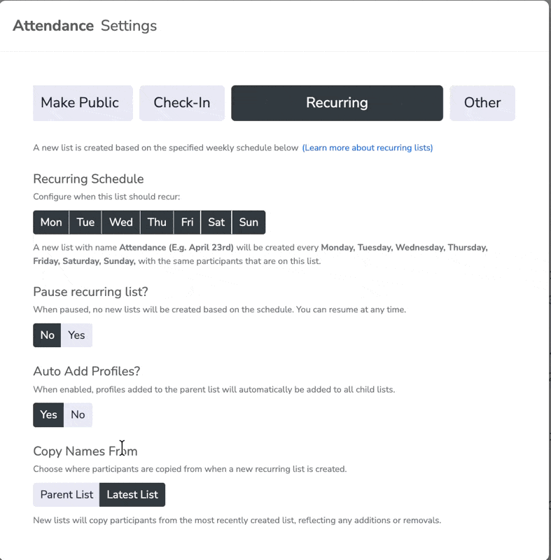 We’ve introduced a new setting for recurring lists that gives you control over how names are carried forward each time a new list is created. With “Copy Names From,” you can choose to always start from your original list or automatically carry forward changes from the most recent list. This means your roster can either stay consistent every time or evolve as people are added or removed. It’s a simple way to keep recurring check-ins accurate without extra manual updates.